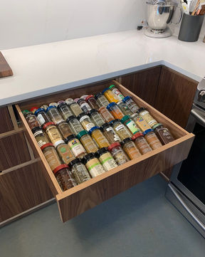 We use Blum hardware for our drawer slides and door hinges. We can make custom drawer dividers and fine tune the layout of the doors and drawers to fit your things perfectly.