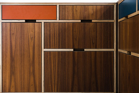 We have 17 different colors of laminate in stock. But we can do custom laminate too, if you've got something specific in mind. Our colored laminate is added to our cabinets by milling away the veneer. It's an additive process. We only add it where we need it.