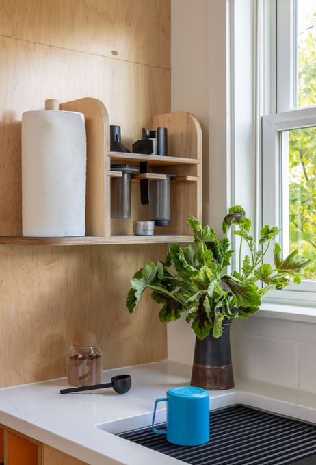 In 2014 Rory and Maria needed a centerpiece for their Seattle bungalow remodel. We connected the modern second floor addition to the newly opened up 1924 home with a vibrant and dramatic staircase. The project was quickly followed with a cozy fireplace surround and bookcase in the living room. During the pandemic Maria added kerfwall to her home office, and in 2024 Kerf was asked to redesign the kitchen. For their latest project we crafted a beautiful freestanding coat and shoe cabinet to separate the entry from the living room.